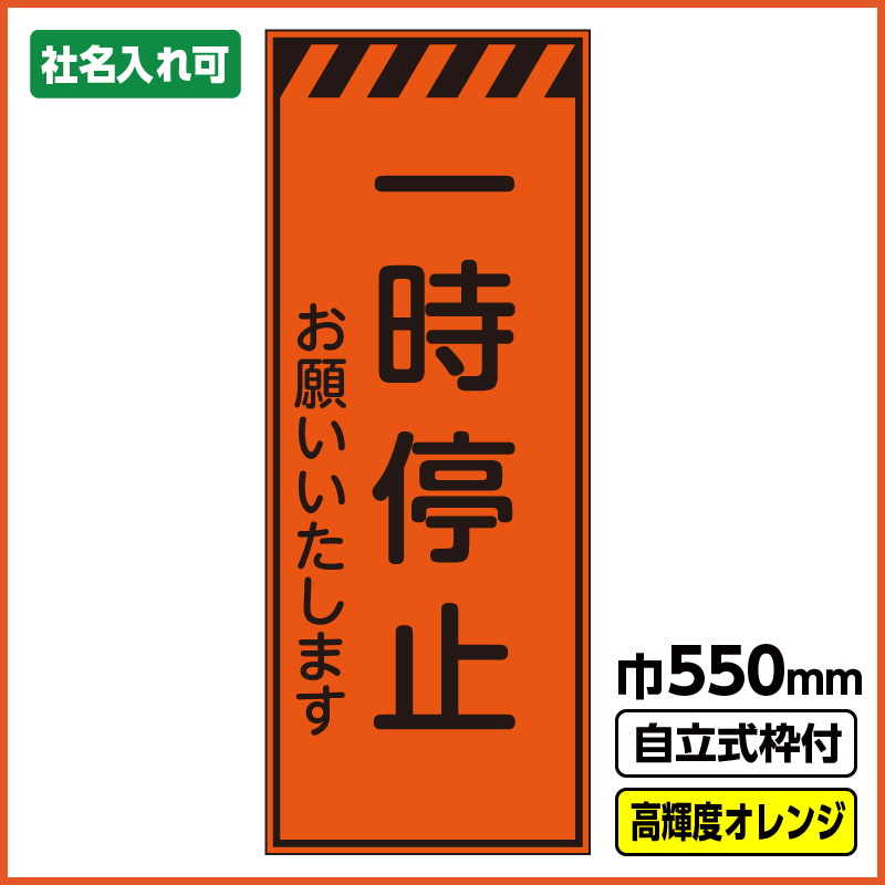 工事看板「一時停止」 550X1400 プリズム高輝度反射 オレンジ 自立式19角枠付