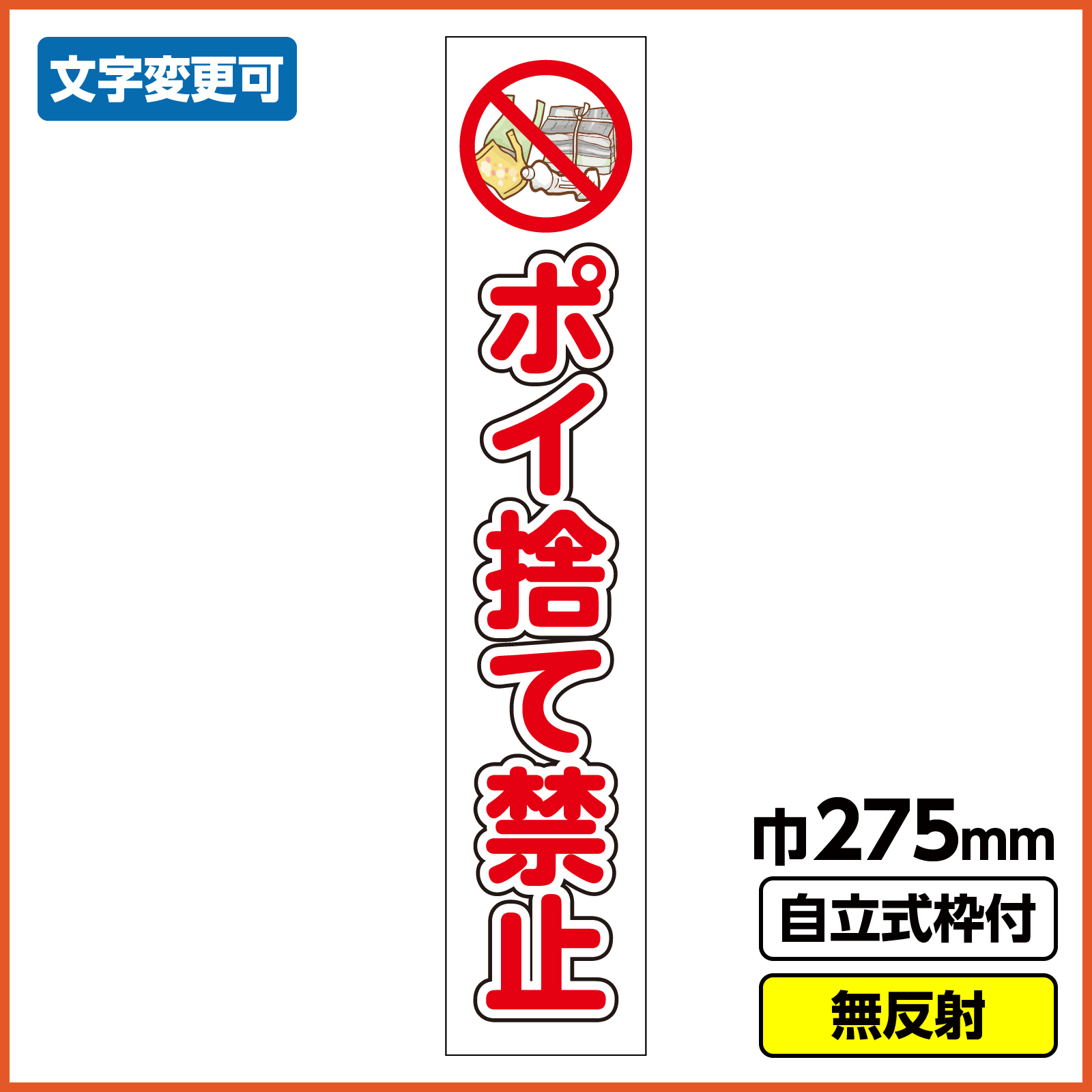 工事看板 スリム「ポイ捨て禁止」 275X1400 無反射 自立式19角枠付